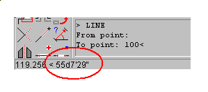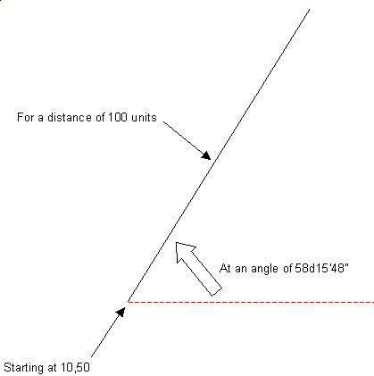 The @ symbol is placed before the Distance and the < symbol before the angle. The program will then draw a line 100 units long (Feet or Meters depending on your job defaults) at an angle of 58d15'48".