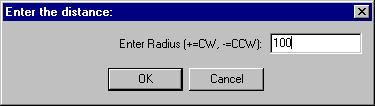 To Select the line, simply place the square over one end of the line and press the left mouse button. - You will then be presented with another dialog box prompting you to enter the radius of the curve (If you enter a positive number, the program will draw a clockwise curve and a negative radius will give a counter clockwise curve.