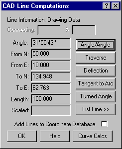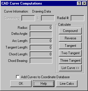 - Pressing the right mouse key, Esc or Enter will bring back the CAD Curves Dialog. We now want to choose on the Line Calcs button in the lower right hand corner. This will bring the CAD Lines Dialog into view. Select on the Tangent to Arc button.
