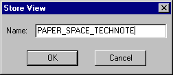 We are then prompted to select either View or Window. Selecting View, prompts you for a name to save the current screen as. For this example, we want to select Window and draw a window around the rectangle (Using our Intersection Object Snap to ensure we trace the rectangle exactly). Once we have traced the window exactly on the rectangle, the following dialog box will appear and you can type in a view name. For this example, I choose the name PAPER_SPACE_TECHNOTE.