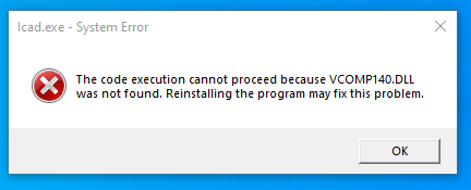 If the VCOMP140.DLL is missing, MSCAD will show the following error message on launching.