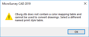 This is because most .stb files do not have a color mapping table, as usually this is something generated from converting a .ctb file to a .stb file, not from stock a .stb file. To solve this message, you can either run the command CONVERTCTB to convert any .ctb file to an .stb file, then select it when running CONVERTPSTYLES, or you can use one of the sample files below. Simply download them and copy them into this folder on your computer: C:\Users\(user)\Documents\MicroSurvey\Print Styles