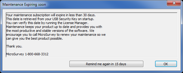 MicroSurvey's desktop software will display this message to remind you to renew your Maintenance Subscription Support Plan. It will start displaying 30 days before the expiry date. To check your expiry date run USB License Manager from the Windows Start Menu.