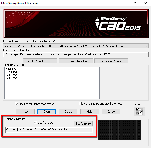Next, open a new drawing using Project Manager.  Ensure that the program is set to use the correct template using the section of the dialog shown below: