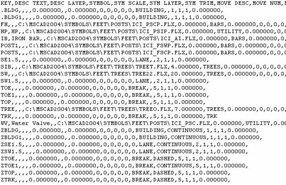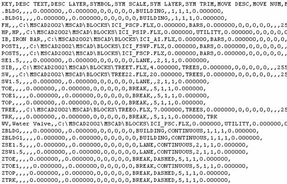 If you had any custom symbols that you created and used in MSCAD2002, we suggest that you create a folder of your own under the Symbols folder ¢‚¬€œ like we did for Trees, etc. Copy all of your symbols into this folder. Update your CSV file as required. The bonus is that the Symbol Librarian command in 2004 will also automatically make use of the symbols in your folder. Looking at my example CSV file with the changes completed: