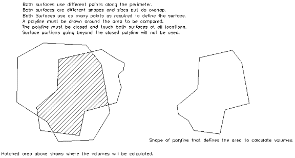 Area Volumes are by far the most common method of calculating volumes between two surfaces.‚ The only restrictions here are: 1) the surfaces must overlap in the areas where volumes are to be calculated. 2) There must be a closed polyline (2D or 3D) enclosing the area to be calculated and it must fall on or touch both surfaces (the polyline does not need to be defined as a boundary to work).