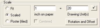SCALED:We are being specific about how the plot will be scaled. To the right of the Scaled button you see two white boxes. If you are working in Imperial then you set the scale by typing 1 in the first box and the desired scale in the second box. The example above will plot at 1"=20'. The second number would be 50 if you required 1"=50' at the scale. If you were working in metric then this is slightly different. The first box is still set to 1 but the second box is set to 1 if the scale was 1:1000. If you required a scale of 1:250 then the second box would be set to 0.25. There is a factor of 1000 build in due to the fact that we used meters as our base units, and the program used with mm. This does not hurt anything and is done behind the scenes.
