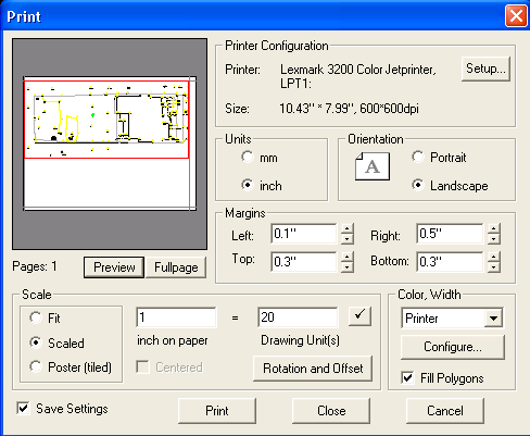 The Fullpage button will draw the preview on the full screen making it easier to look at and determine if it is correct for what you desire. If you do change the Scale option then keep in mind that the drawing scale you started the drawing with may not match the plotting scale and some things like text and symbols may not be the correct size. The drawing scale and plotting scale should be the same if possible.