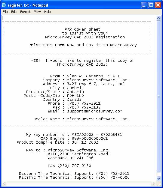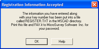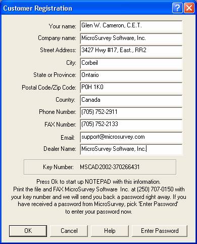You will be informed that your info and the MicroSurvey Key number have been saved in a file. Please print this file out and fax it to the MicroSurvey head office at 250-707-0150 and you will be sent back a password in a few minutes. (Our Eastern Technical Support Office can not issue passwords)